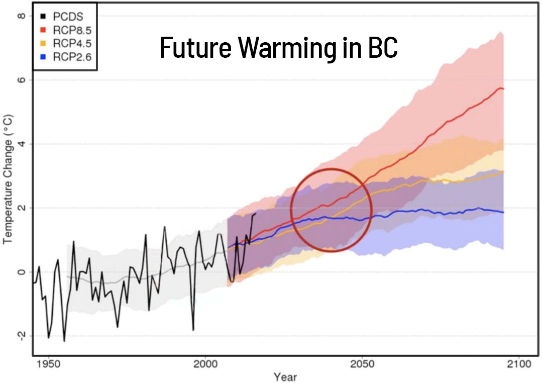 Although there is a level of uncertainty about which emissions pathway we will be on, like with a pandemic, it is important to start planning early to make sure we do not have a worse situation in the future. If you consider the graph of “Future Warming in BC”, all 3 emission pathways have a close range of projected warming for the year 2050 in British Columbia. As the majority of our planning is within that timeframe, we can start thinking about how we can adapt our policies and practices for around 3°C of warming from a 1961-1990 baseline and the implications of that temperature change. This could include short and long-term planning processes like asset management, building and infrastructure design, disaster risk reduction or land-use planning.